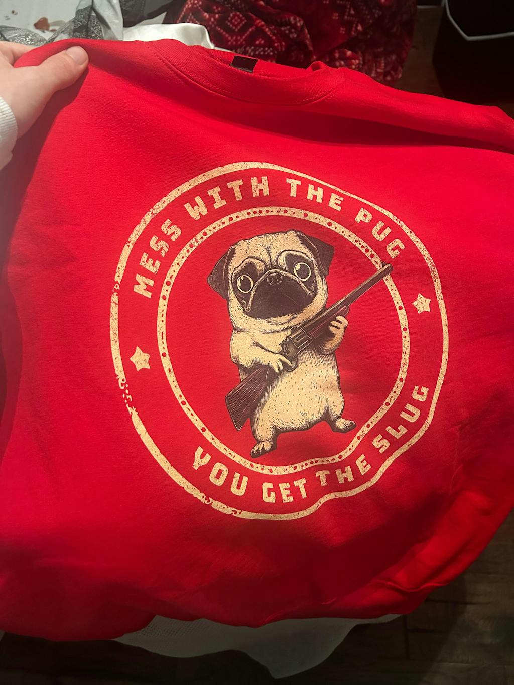 Completely satisfied with the price of the t and the quality of the print! can’t wait for cooler temps to rock this with my pug appropriately named “Slugga”!!!!
