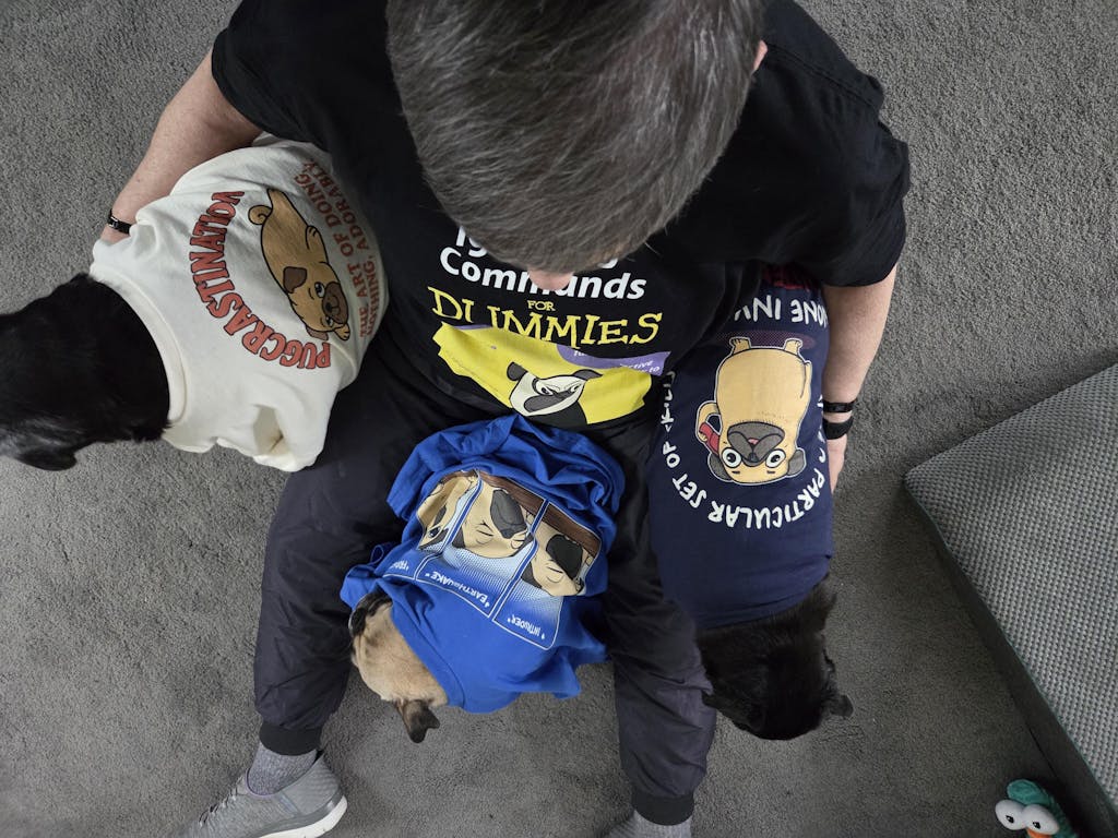 Really appreciate you taking the time to leave multiple reviews and photos too. Glad to hear the fits and colors are landing right… and it sounds like at least one pug is being very accurately called out across all three shirts.